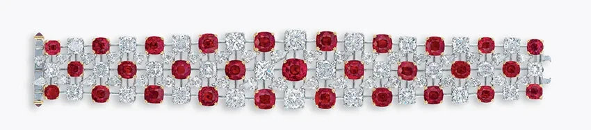 Vòng tay đá hồng ngọc và kim cương Faidee, trị giá 3.400.000 USD vào năm 2016, là một tác phẩm nghệ thuật trang sức với những viên đá hồng ngọc có màu đỏ ruby sâu thẳm, tượng trưng cho tình yêu và đam mê, với những đường cắt phức tạp để tối ưu hóa ánh sáng và tạo ra hiệu ứng lấp lánh, huyền ảo.